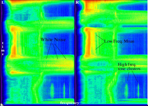 The more concrete wooden sounds end abruptly, followed by a half breath of silence. In this portion only three sounds present themselves; a band of white noise, it's envelope shaped by a triangle wave that slows and speeds frequency in turns, while panning to and fro. A subtle, low moan with the same oscillating treatment, presumably derived from the subtractive filtering of the white noise. As well, a high pitched, keening cluster of tones that fades in and out like a spectre. These elements combine to emulate a skein of sunlight that skips along the ripples of the oceans surface.