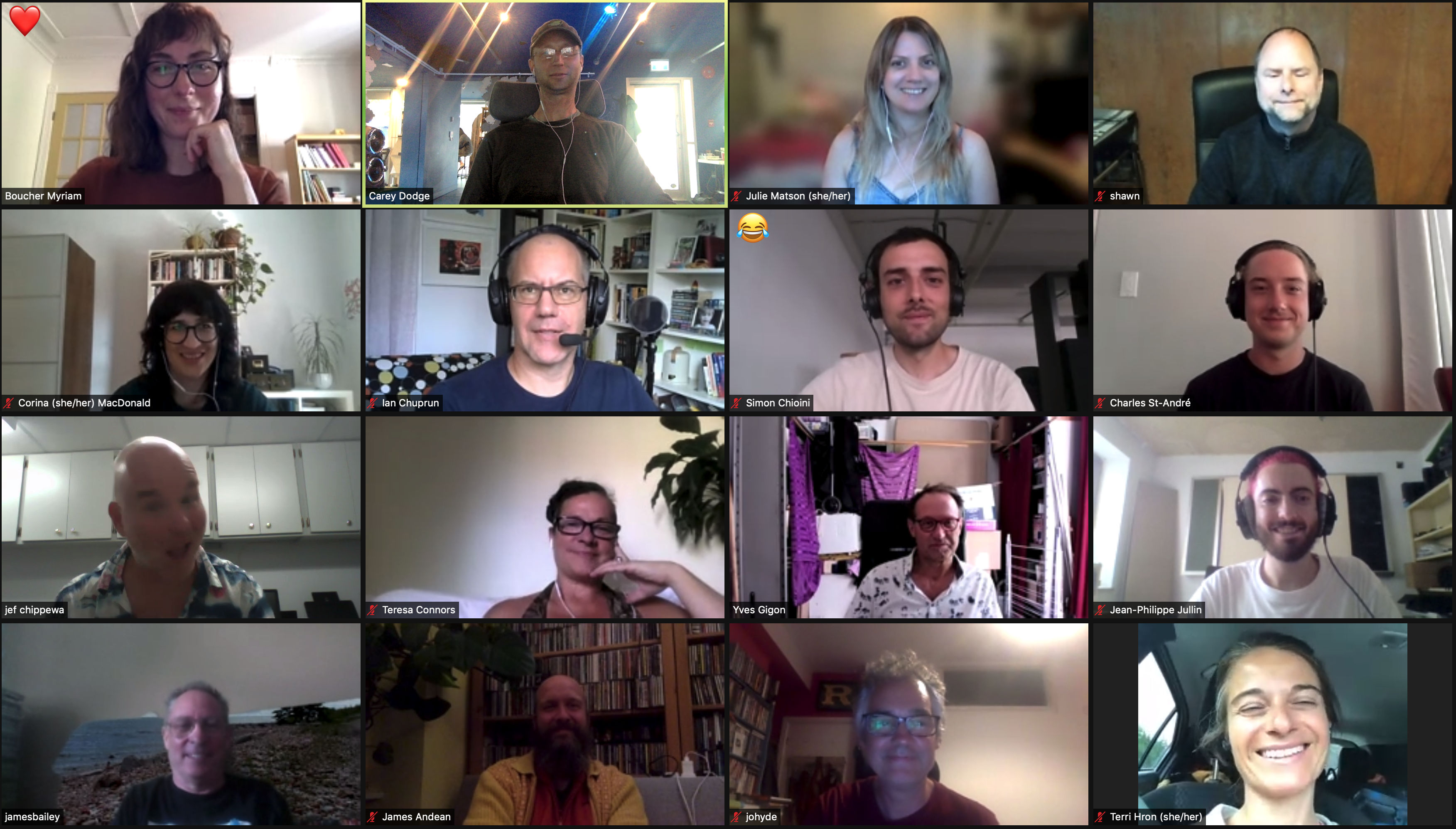 Present for the CEC’s 2021 AGM were CEC Board members James Andean (JA, in Leicester UK), Myriam Boucher (MB, in Montréal), Teresa Connors (TC, in Montréal), Carey Dodge (CD, in Vancouver), Joseph Hyde (JH, in Bath UK), Corina MacDonald (CM, in Montréal), Shawn Pinchbeck (SP, in Edmonton) and Julie Matson (JM, in Vancouver), CEC Admin Yves Gigon (YG, in Montréal) and jef chippewa (JC, in London ON), and CEC Members James Bailey (JB, in Toronto), Ian Chuprun (IC, in Montréal), Simon Chioini (SC, in Montréal) and Terri Hron (TH, on the road), as well as JTTP 2021 winners and award recipients (both in Montréal) Jean-Philippe Jullin (JPJ) and Charles St-André (CSA).